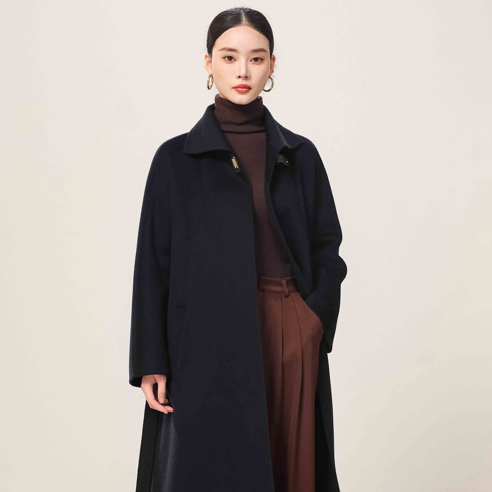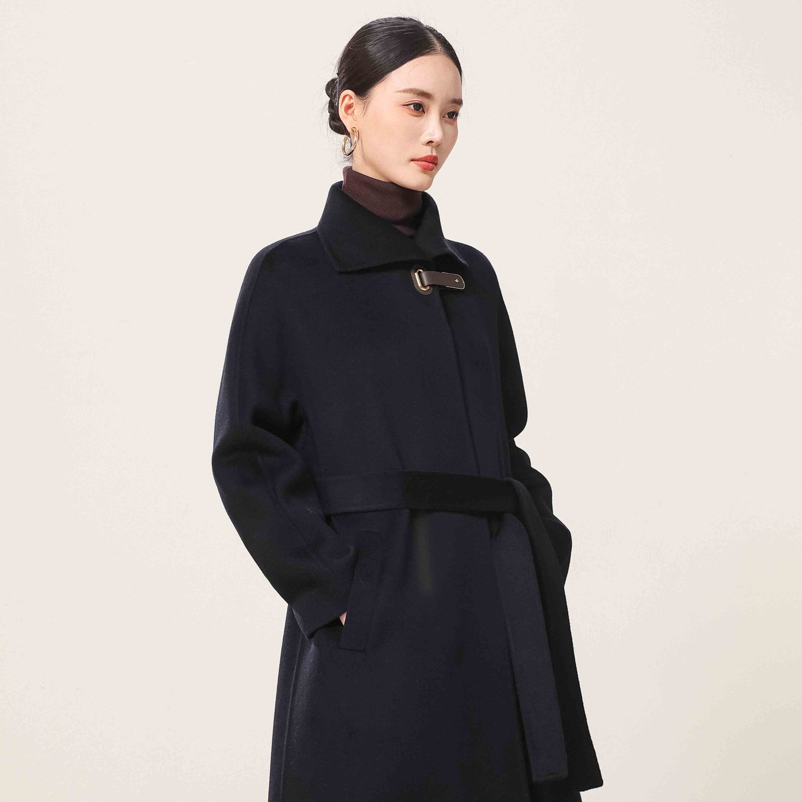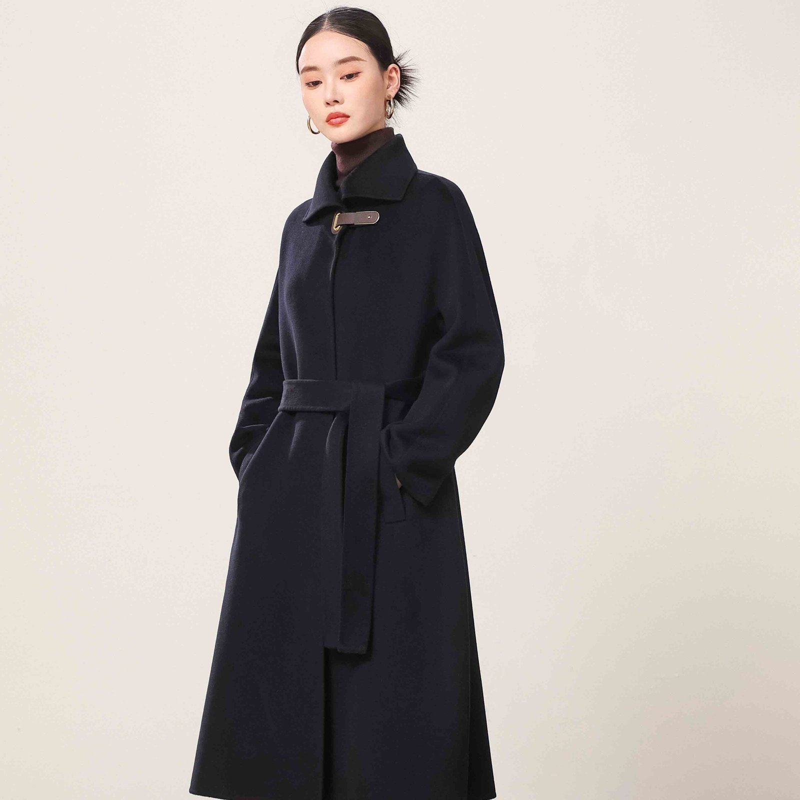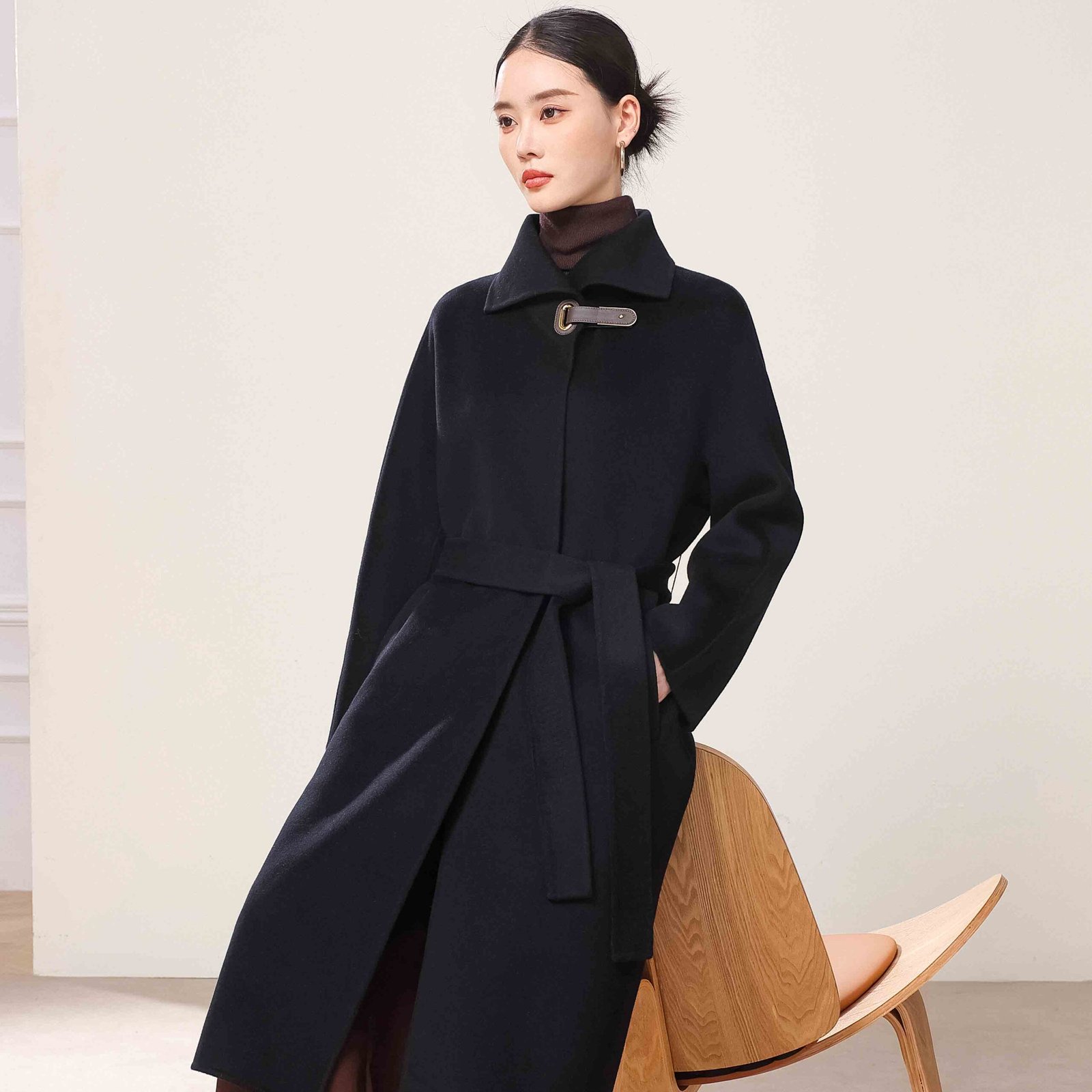 Jingshang Cashmere, as one of the professional cashmere coat manufacturers and a high-end cashmere yarn and garment manufacturer with over thirty years of history, has always been committed to combining top-quality raw materials with exquisite craftsmanship to provide global customers with high-quality, sustainable cashmere products. Our Black Leather Buckle Cashmere Coat is a classic recommended style from Jingshang, combining luxurious texture with comfortable touch, suitable for wholesale purchasing and personalized customization.